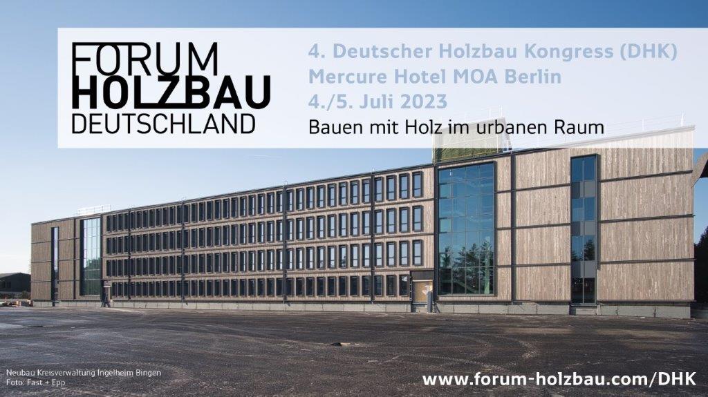 Zum „4. Deutschen Holzbau Kongress“ (DHK) am 4. und 5. Juli 2023 im Tagungszentrum MOA in Berlin-Mitte erwartet der Landesbeirat Holz Berlin/Brandenburg und das FORUM HOLZBAU als Veranstalter wieder rund 700 Teilnehmende.