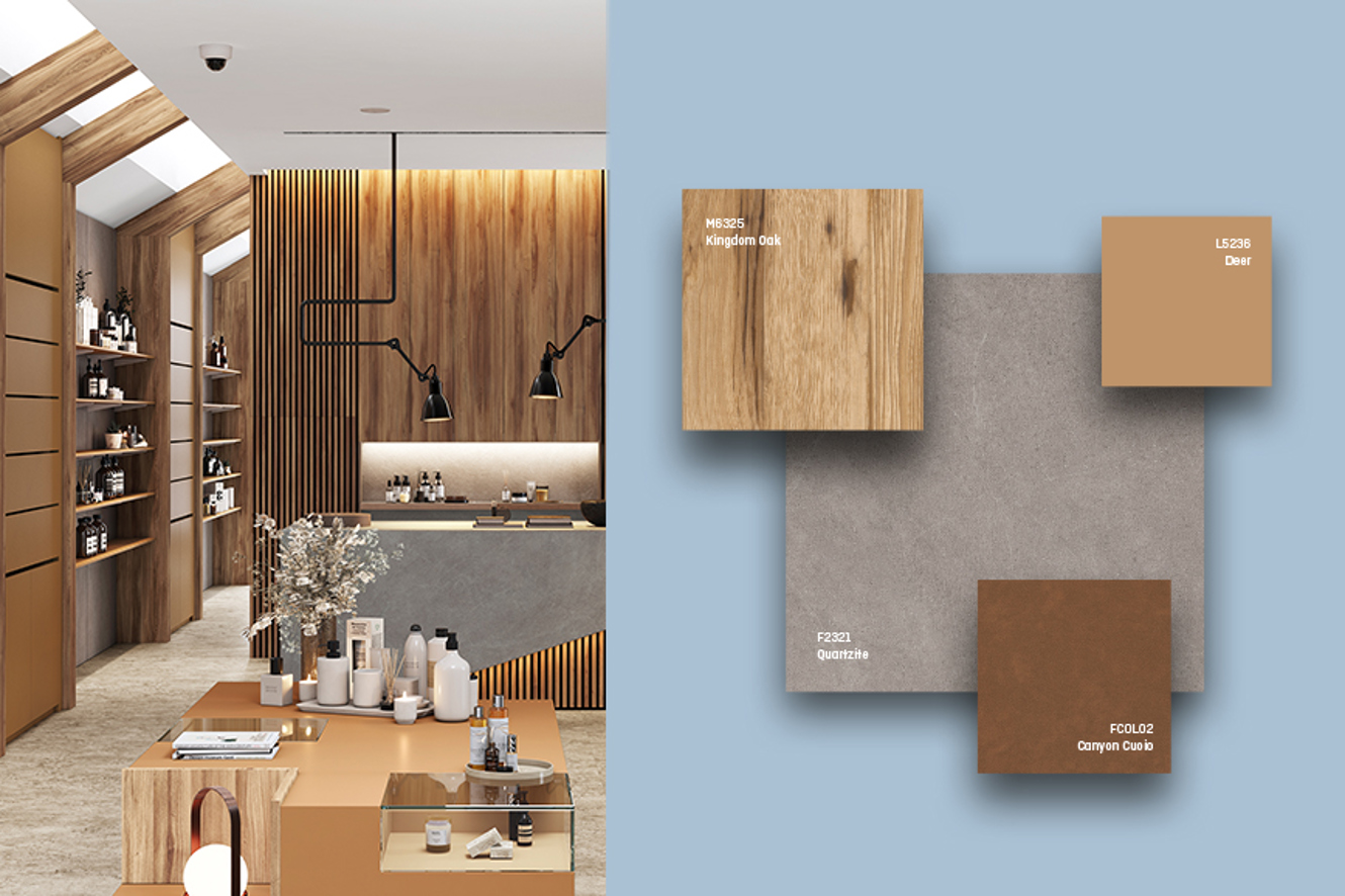 Mocha Mousse se combina perfectamente con materiales naturales, especialmente la madera. Cuando se asocia con superficies de madera en tonos cálidos de Innovus, como Italian Echo (M6341) y French Echo (M6342), se convierte en un verdadero protagonista, aportando profundidad y sofisticación a cualquier proyecto.