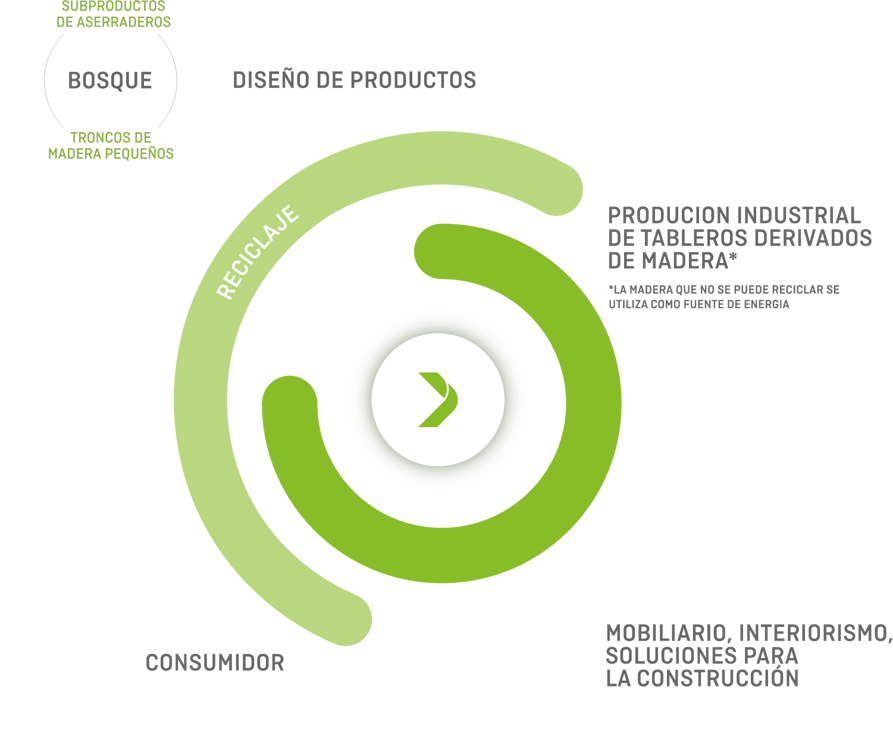La madera constituye la base de nuestra cadena de valor, que comienza con el uso de materias primas de origen sostenible, incorpora subproductos de la industria maderera y, con un enfoque circular, cierra el ciclo con la reutilización y el reciclaje de los residuos, que también se emplean en la fabricación de tableros derivados de la madera, manteniendo este material en circulación. Este es un ciclo virtuoso, y la madera reciclada puede ser reintegrada en el proceso en innumerables ocasiones.