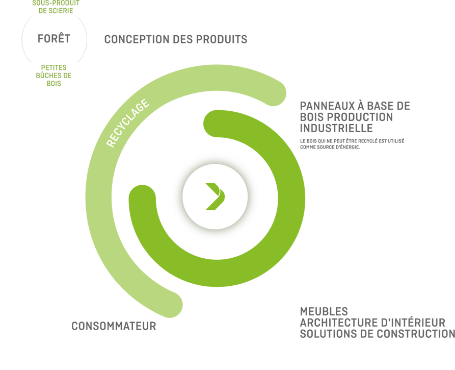 Le bois est à la base de notre chaîne de valeur, qui commence par l'utilisation de matières premières provenant de sources durables, incorpore des sous-produits de l'industrie du bois et, dans une approche circulaire, ferme le cycle avec la réutilisation et le recyclage des déchets, qui sont également intégrés dans la fabrication de panneaux à base de bois, ce qui maintient la circulation de ce matériau. C'est un cycle vertueux, et le bois recyclé peut être réintégré dans le processus d'innombrables fois.